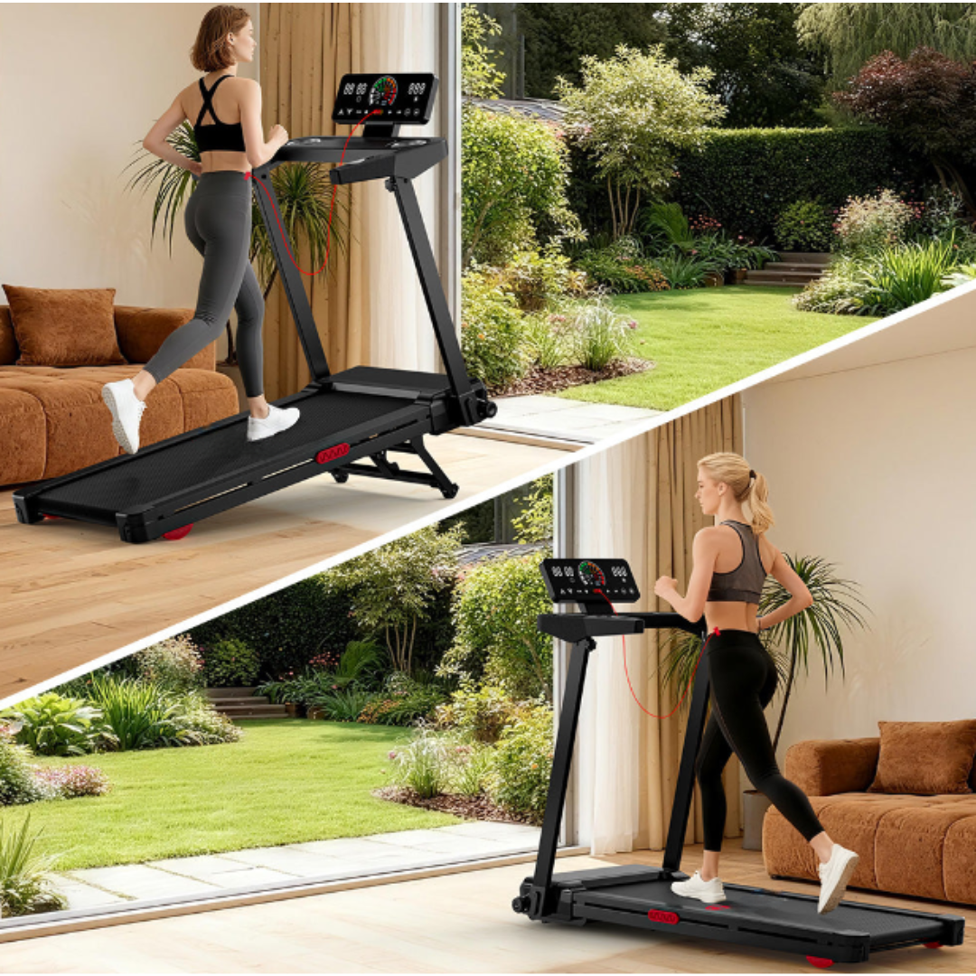Tapis de course électrique pliable avec vitesse réglable de 1 à 16 km/h et inclinaison automatique 0-15%. Équipé de 18 programmes d’entraînement (15 préétablis et 3 personnalisés) et d’un grand écran LCD affichant vitesse, temps, distance, calories, inclinaison, fréquence cardiaque et pas. Compatible avec les applications Zwift et Kinomap pour plus d’options d’entraînement.